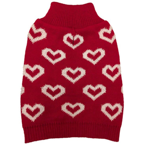 Fashion Pet All Over Hearts Dog Sweater Red. This adorable dual texture sweater is Soft and cozy. Features puffy chenille hearts on an acrylic knit background. Mock neck turtleneck and leash hole.