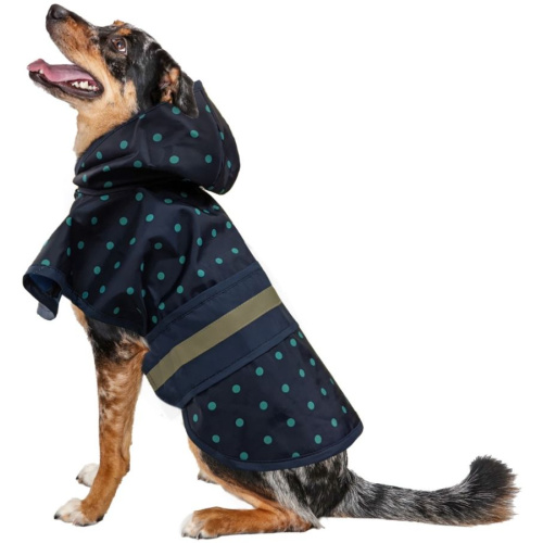 Chase the rain away in this adorable polka dot raincoat with matching hood, reflective taping and leash hole. Water resistant and phthalate free