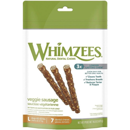 Whimzees Large Veggie Sausage Dog Treats. Hollow shapes and spaces allow teeth to grip and chew more easily while providing a long lasting chew. These highly digestible low fat treats are GMO-free, gluten free, grain free and contain no artificial colors or flavors.