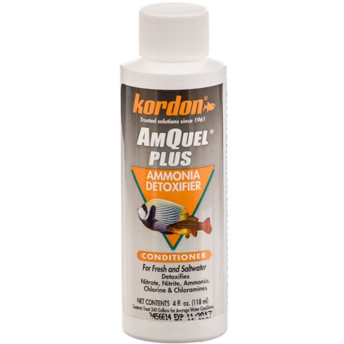Kordon AmQuel + Water Conditioner - 4 ozKordon AmQuel Plus Ammonia Detoxifier water conditioner protects fishes and invertebrates by eliminating Nitrite, Nitrate, and all forms of Ammonia, Chloramines, and Chlorine. It removes fishs toxic pheromones and toxic organics and does not affect the waters pH. AmQuel Plus is safe to use in reef and live rock aquariums.