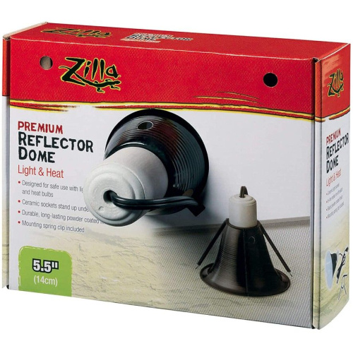 Zilla Premium Reflector Dome - Light & Heat - 5.5"The Zilla Premium Reflector Dome is designed meets higher-heat requirements of reptile incandescent and infrared heating elements. It features a heat-resistant ceramic socket and long-lasting powder-coated finish for superior heat tolerance.